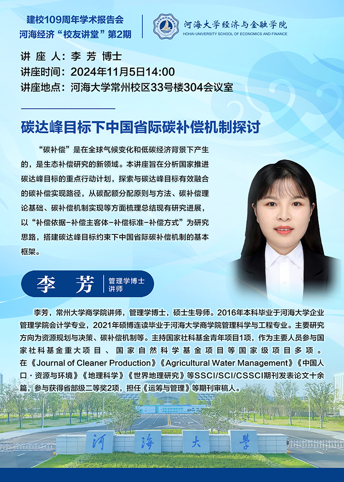 邀请了校友李芳博士为广大师生做了题为“碳达峰目标下中国省际碳补偿机制探讨”的学术讲座。李芳校友现就职于常州大学商学院,讲师,2016年本科毕业于欧洲足球联赛